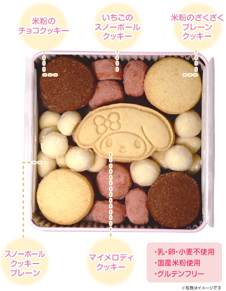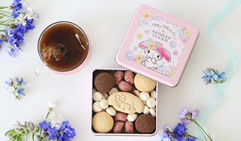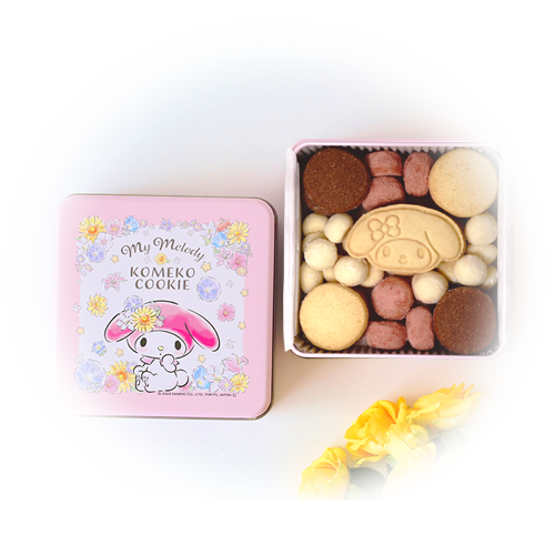 | 内容量 | 缶入り39枚 (プレーン約7g×7枚、チョコ約7g×6枚、スノーボールいちご約4g×6個、スノーボールクッキー プレーン 2g×18個、マイメロディ約10g×2枚) |